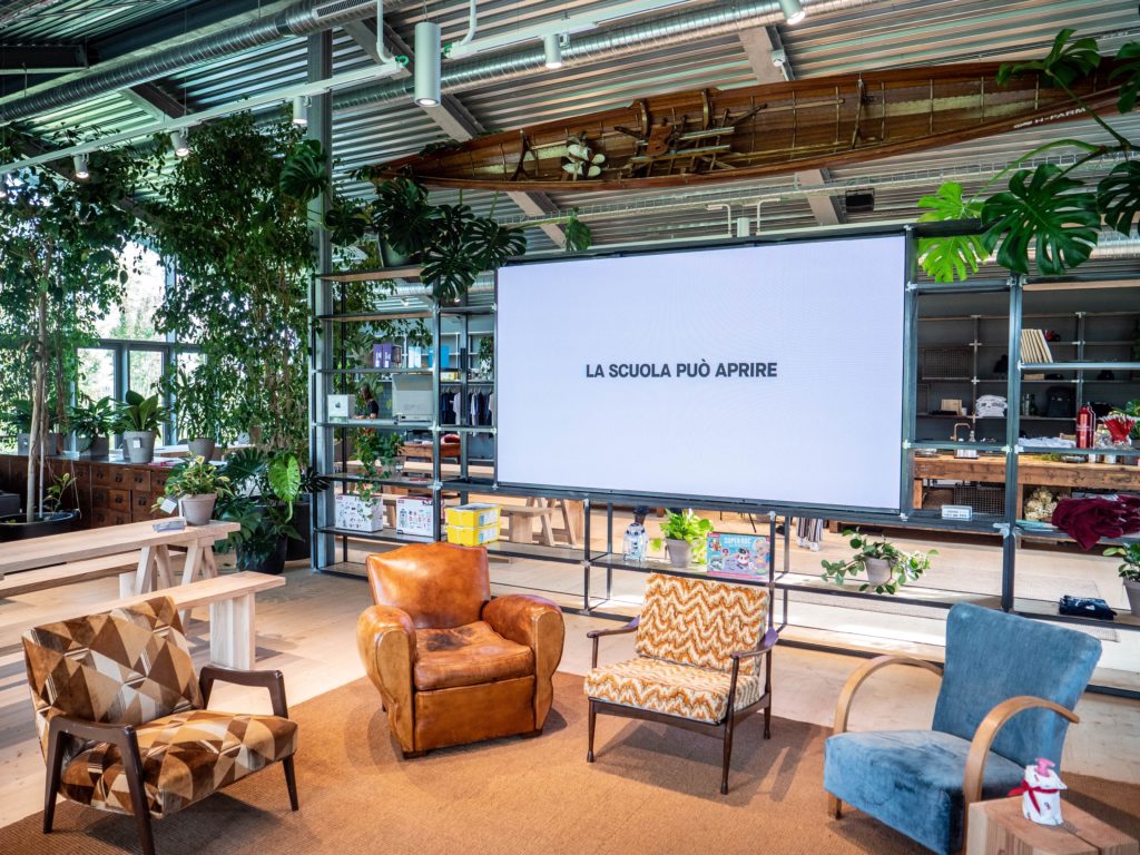 This is the main entrance with access to the vast campus. The welcome centre hosts in its 400 square meters the reception desk, the large dedicated shop and some spaces for working or meeting with colleagues and partners. The architectural lines in post-industrial style harmoniously welcome vintage-style furnishings and a 130" LED Wall, which thanks to the LG SuperSign digital signage solution, is a spectacularly visual element for internal communications, corporate branding, as well as support for speakers and workshops when the welcome area is, if necessary, transformed into a venue for events.