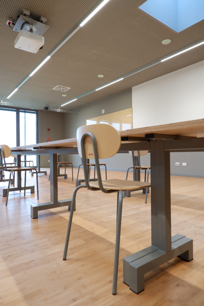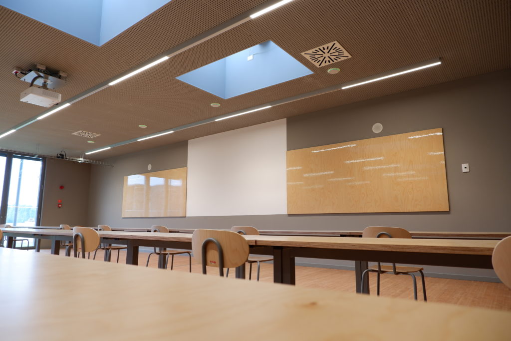 The EBL610U model was chosen for the projection, capable of responding to educational needs despite the moderate height of the classrooms, imposed by the architectural standards that embed the complex into the surrounding natural environment. In the teacher area there is also an Atlona Omega panel with HDbaseT and USB-C ports for immediate connection between laptop or tablet and the classroom AV system.