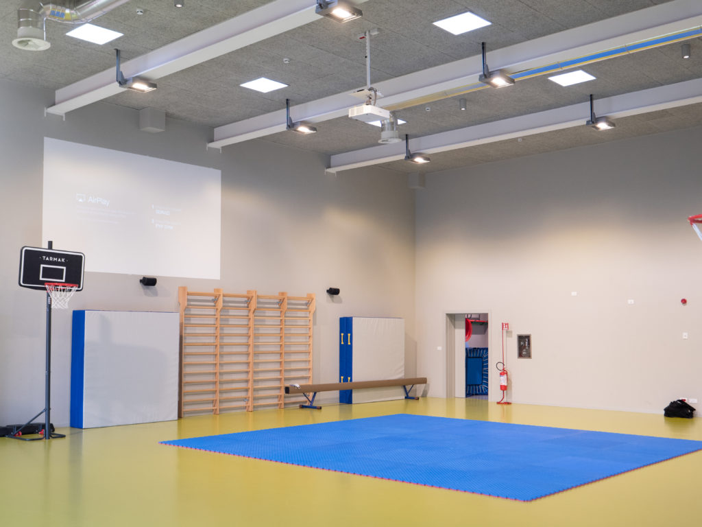 The building also has an indoor gym, equipped with Tannoy wall speakers and Epson projection, a canteen and various recreational spaces with a sound system for background music and service communications.