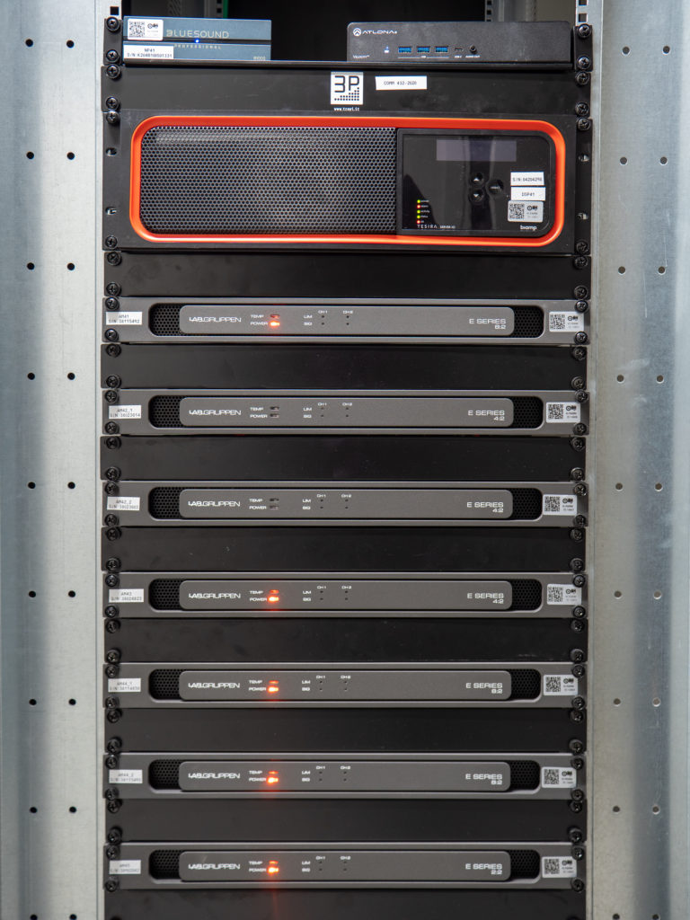 The background music is diffused into the environment with a rain configuration of Tannoy AMS5ICT in combination with the Bluesound B100S network music player and thanks to the reliable ethernet connection, guarantees uninterrupted music streaming. Specially designed for integrated audio systems, this player features a specific design for rack mounting, euroblock connectors and a protocol pre prepared for configuration with third-party control systems.