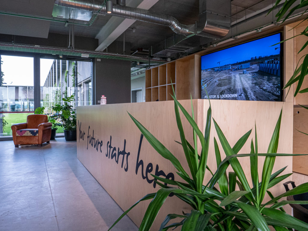 At the entrance there is a 86" 4k display useful for disseminating updates on the campus, relating to the building and the promotion of activities and events. This is one of the approximately 60 networked displays integrated into the halls and common areas of the campus to ensure widespread and timely communication in such a vast ecosystem.