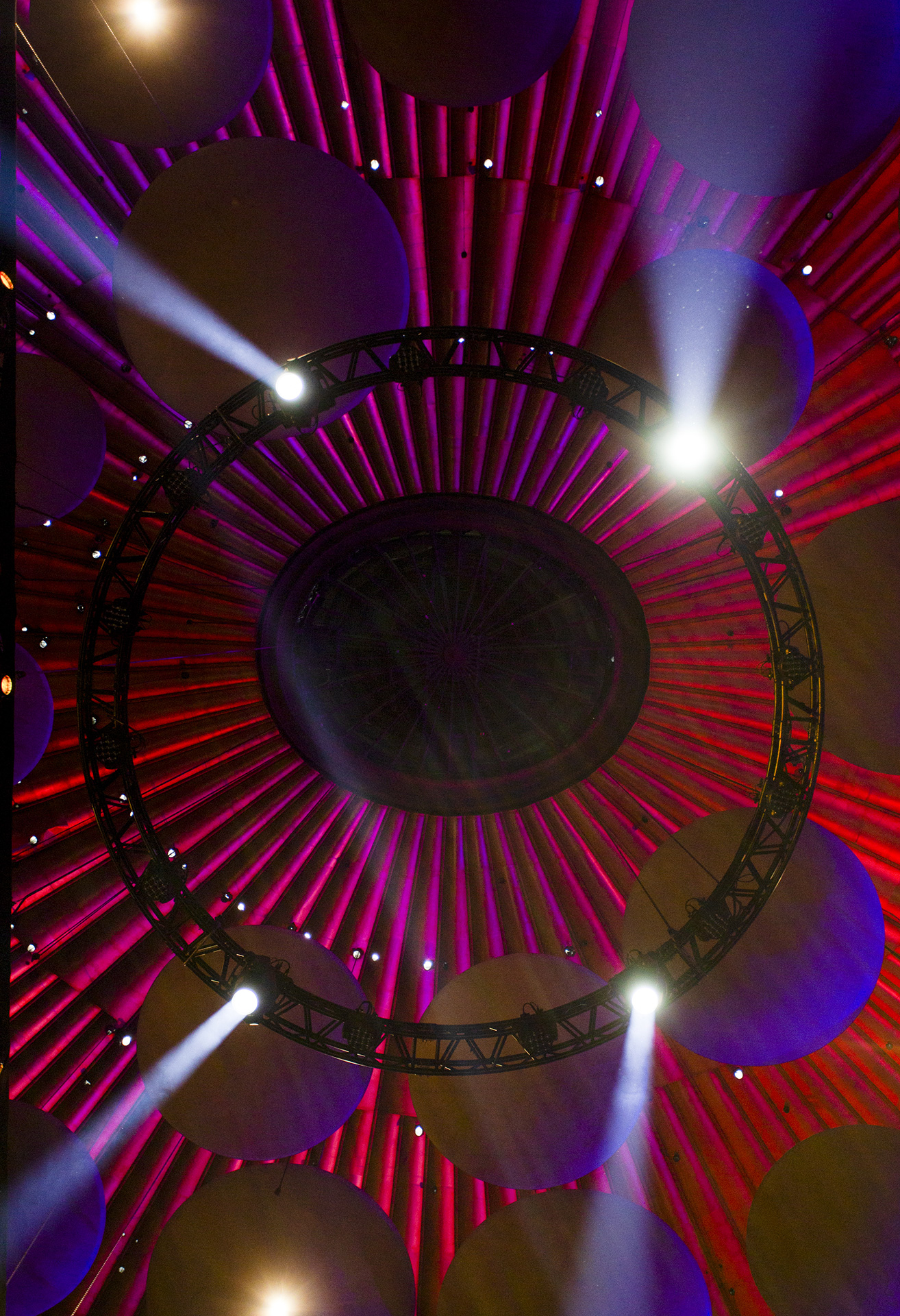 The MAC Ultras are positioned three levels up on the circle, in the gallery, and on a central circular truss.